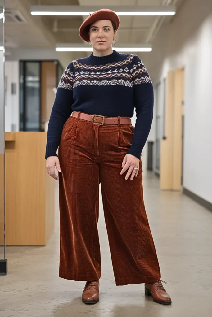 Team a navy Fair Isle sweater with rust-colored wide-leg corduroys and brown Oxfords. Add a wool beret for a retro, creative-office vibe.