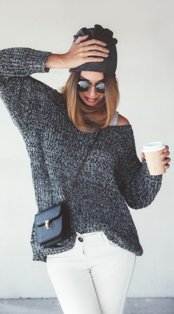 A dark charcoal oversized knit sweater paired with off-white pants creates a soft, stylish contrast. A black crossbody bag keeps things practical, while a slouchy beanie and sunglasses add an effortlessly cool touch—perfect for a relaxed coffee run on a chilly morning.