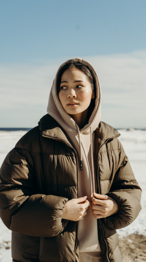 A puffy brown jacket layered over a neutral hoodie delivers ultimate casual winter comfort. With its oversized fit and warmth, this look is great for brisk walks and relaxed outdoor activities.
