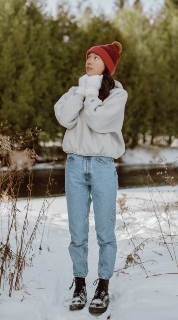 A light gray sweatshirt with classic blue jeans makes for an easy, outdoorsy winter ensemble. A red pom-pom beanie adds a cheerful pop of color, while sturdy black boots keep the outfit practical for wintry walks.