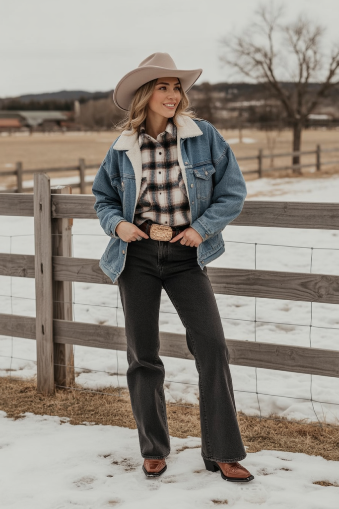 A denim sherpa jacket over a plaid flannel shirt evokes the charm of crisp country mornings. Add a wide-brimmed hat, a statement belt buckle, and straight-cut jeans for a look that’s both rugged and refined. Perfect for casual outings, school events, or winter weekends outdoors.