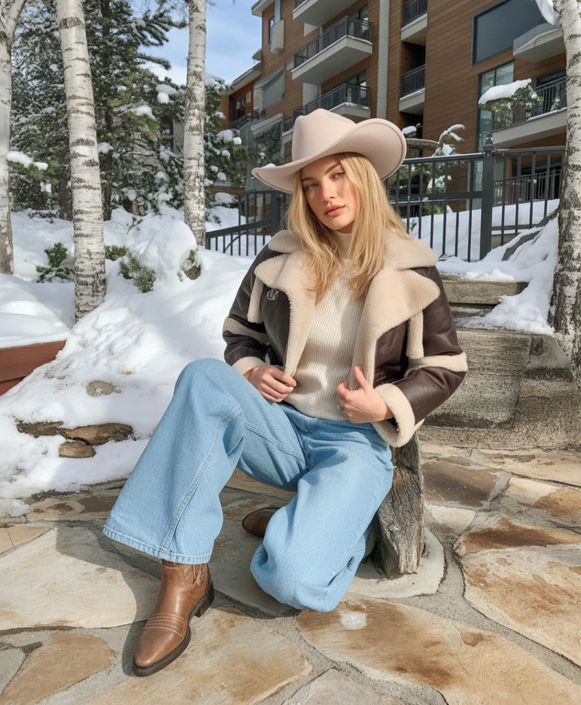 A cropped shearling jacket with wide-leg jeans modernizes traditional Western outerwear. Add a cowboy hat for polish—ideal for both casual days and evening outings.