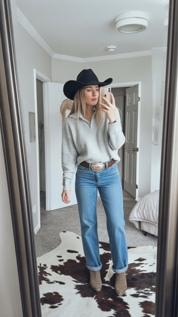 Keep it simple with a slouchy sweater tucked into light-wash jeans, accented by a bold belt buckle and classic hat. Effortless, cozy, and endlessly wearable.