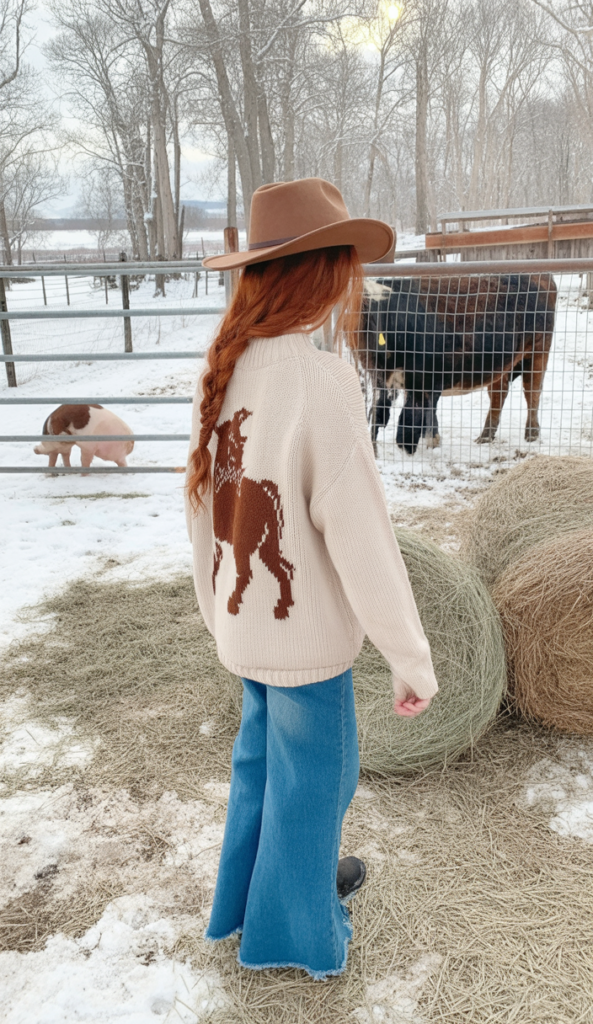 Show off your Western spirit with a chunky knit featuring a horse pattern. Pair it with flared denim and a wide-brimmed hat for an authentic countryside look.