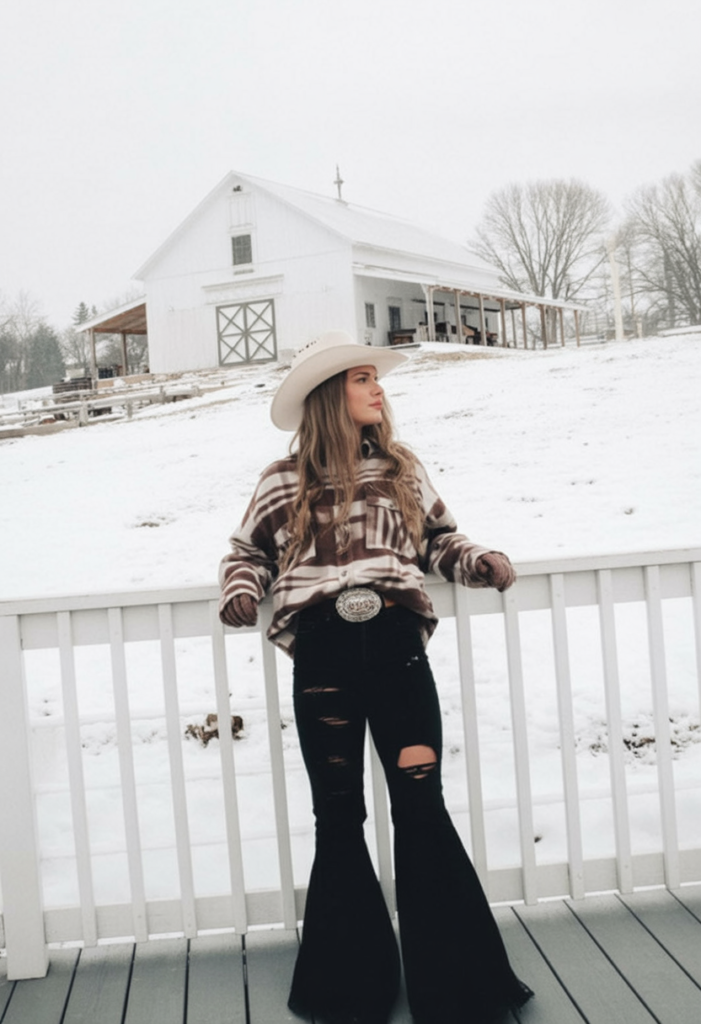 Combine a plaid shirt with distressed black flared jeans and a western belt for an edgy, modern cowgirl vibe. A white hat adds contrast and flair—perfect for concerts or casual nights out.