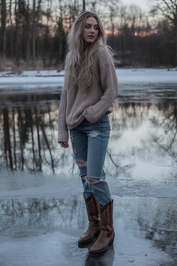 A chunky knit sweater, worn with faded denim and classic cowboy boots, proves that effortless dressing can still look stylish. The ultimate cozy-day outfit.