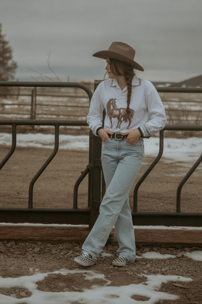 A horse-print polo paired with denim and a brown hat delivers a youthful, ranch-inspired energy. Swap in sneakers for a casual twist that still honors Western roots.