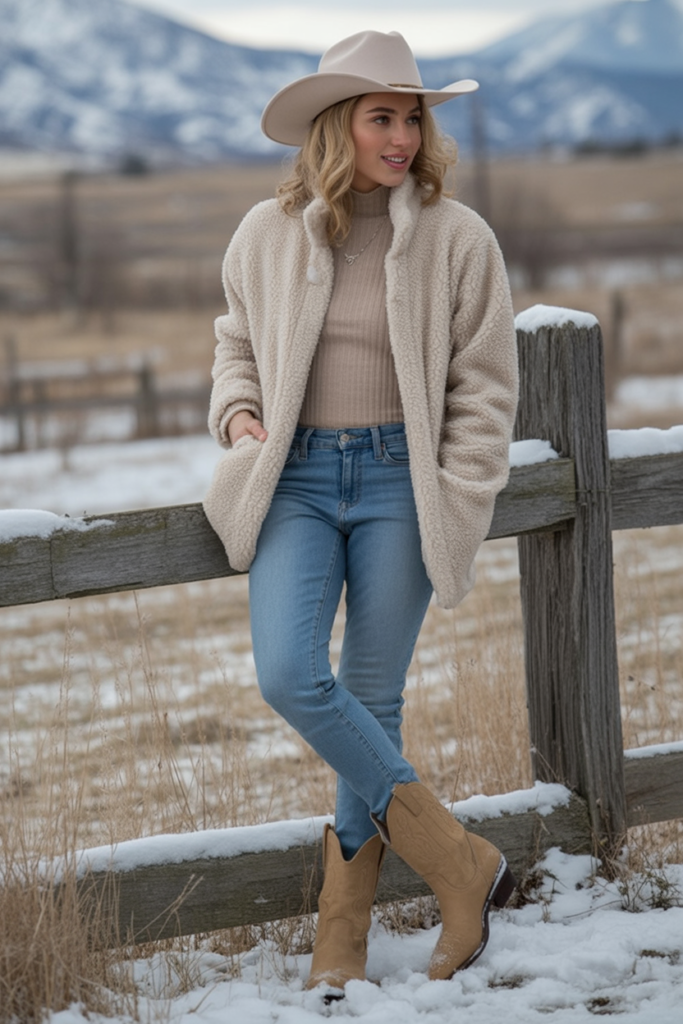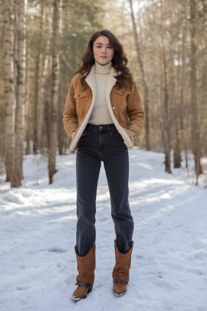A shearling jacket, turtleneck, and straight-leg jeans form the ultimate cozy trio. Light neutrals and classic cuts make this outfit timeless, while cowboy boots ground it firmly in Western tradition.