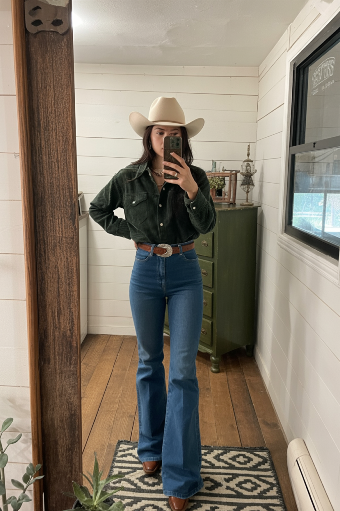 Bring texture and color into winter dressing with a green corduroy shirt, high-rise jeans, and a statement belt. It’s subtle yet striking—a retro revival done right.