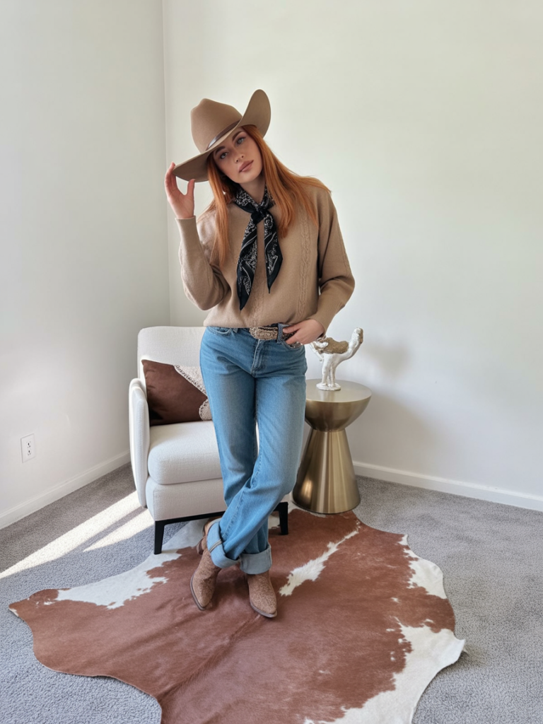 Elevate a simple taupe sweater with a knotted bandana and a cowboy hat. This look balances modern minimalism with classic Western personality.