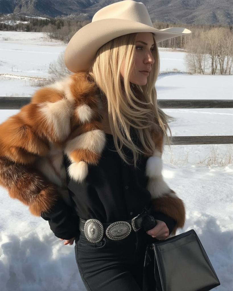 Channel pure Western glam with a rich fur jacket over an all-black ensemble. Top it with a wide-brimmed hat and silver belt for a daring, night-out statement.