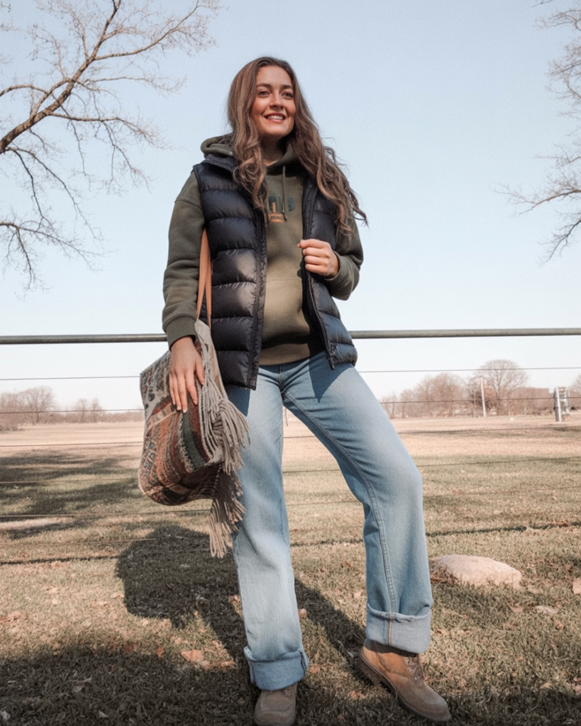 For casual comfort, layer a hoodie under a puffer vest with cuffed denim and rugged boots. Add a patterned tote to bring in that country charm without overdoing it.