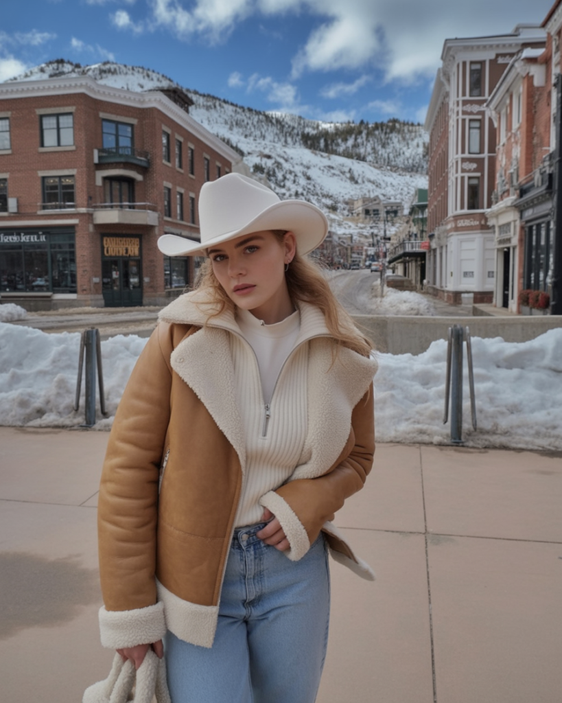 Blend urban sophistication with Western flair by layering a shearling-lined tan jacket over a white ribbed sweater and light denim. Finish with a crisp white hat for a look that’s equally at home on city streets or countryside roads.