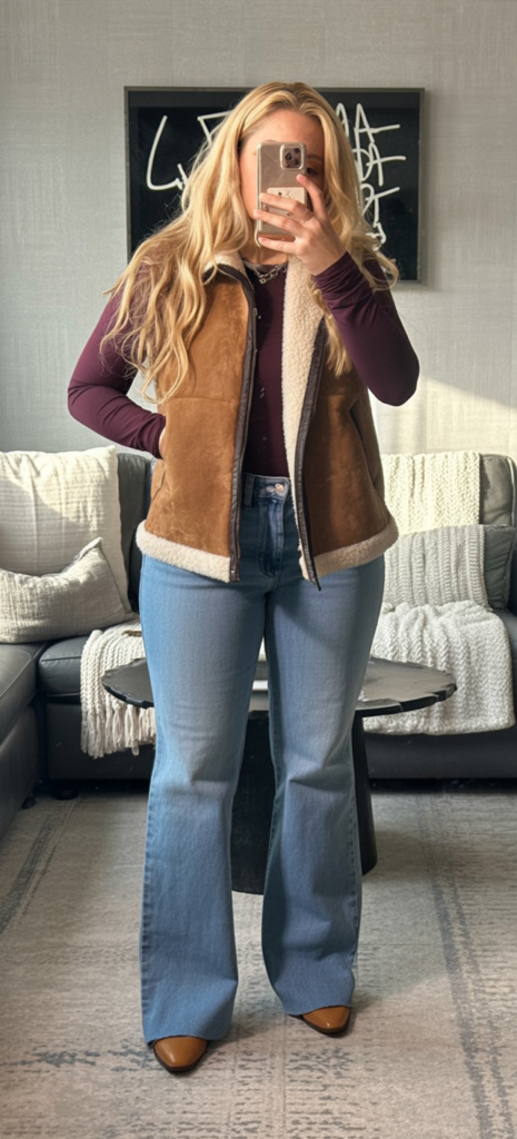 A shearling-lined vest paired with flared jeans creates a flattering retro-inspired silhouette. This 70s nod works beautifully for all body types and transitions easily from day errands to casual dinners.