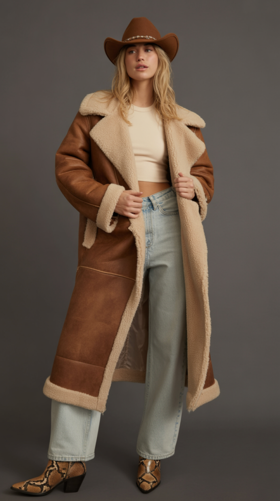 Turn heads in a floor-length shearling coat layered over denim and boots. Equal parts dramatic and luxurious, this outfit makes cold-weather dressing feel glamorous yet authentically Western.